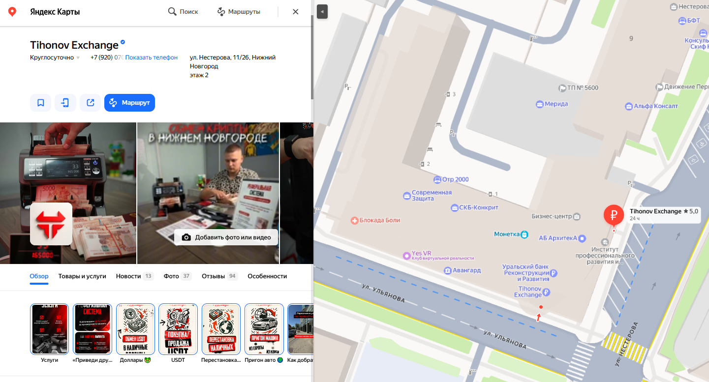 Сервис Tihonov Ex специализируется на обмене USDT. Работает только с парой USDT/RUB. Другие криптовалюты не принимает. Формат работы офлайн в центре города.