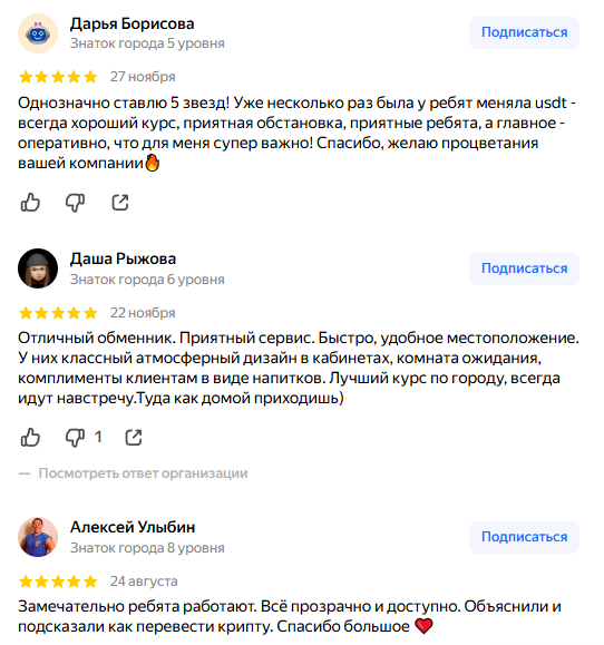 На Яндекс Картах собрано около ста отзывов о Tex Exchange. Все отзывы положительные. Ни одного негативного комментария. Это выглядит подозрительно для любого бизнеса. Клиенты отмечают выгодный курс обмена. Хвалят скорость проведения операций. Пишут про уютный офис с приятной атмосферой. Довольны вежливостью сотрудников.