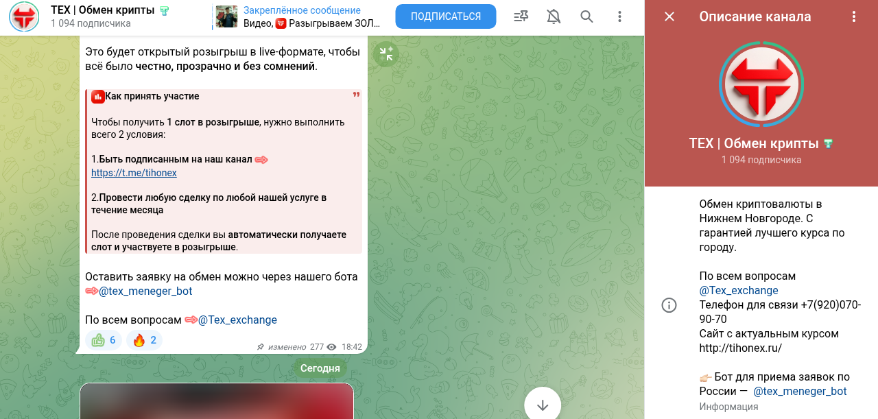 Телеграм-канал компании работает по ссылке @tihonex. Называется TEX | Обмен крипты. Аудитории всего 1+ тысяча подписчиков, просмотров у постов примерно по 200-300. Возможно, есть боты.