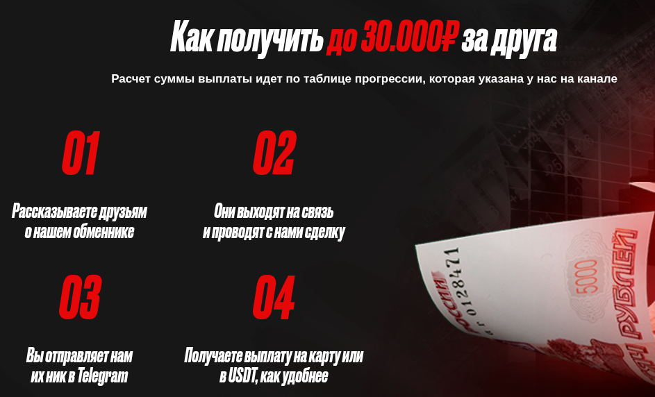 У Tihonov Exchange есть реферальная программа. За приведенного клиента, который проводит сделку, рефер получает вознаграждение в размере до 30 000 рублей за одного человека и, по прогрессивной шкале, до 90 000 рублей. Выплата — на карту или в USDT.