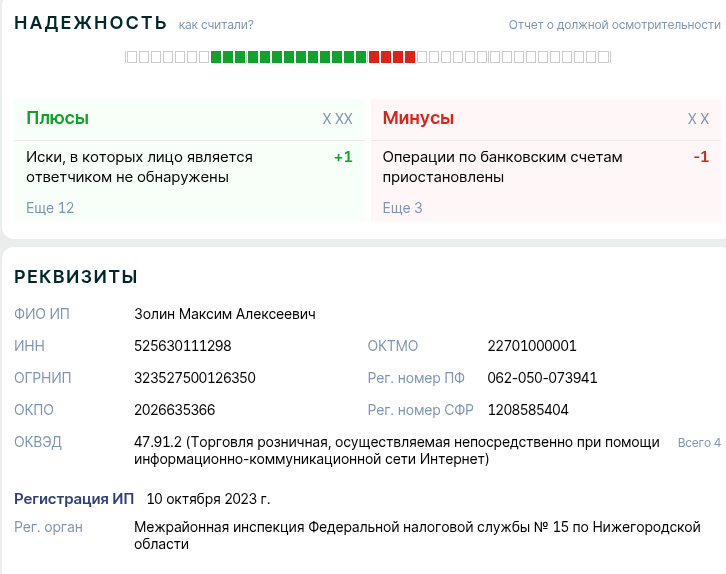Но есть проблема. Деятельность этого ИП — Торговля розничная, осуществляемая непосредственно при помощи информационно-коммуникационной сети Интернет. Не деятельность по обмену валюты. А еще сервисы фиксируют высокие риски работы с компанией — операции по банковским счетам приостановлены.