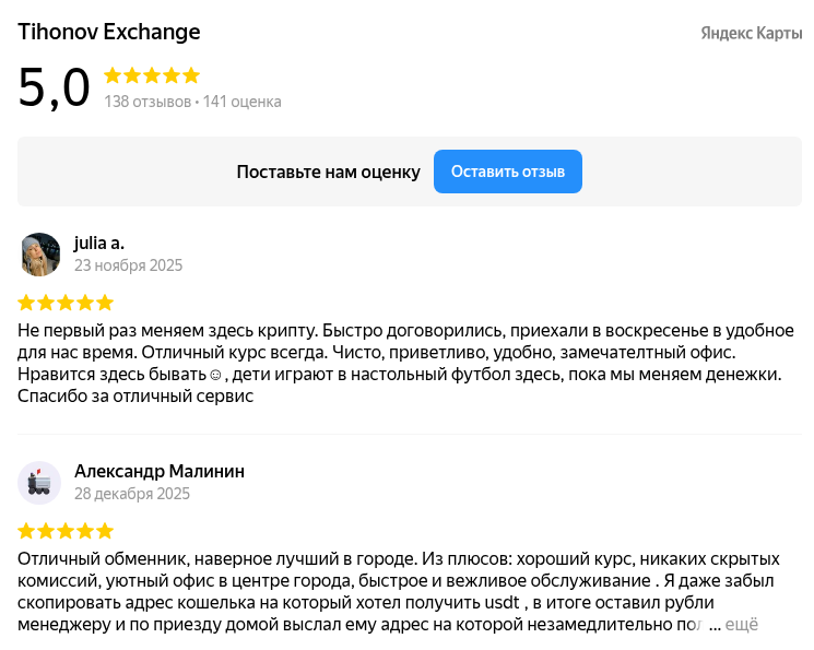 На Яндекс.Картах у компании 141 отзыв и 5 звезд из 5. Все оценки и отзывы прям идеальные. На независимых площадках отзывов у Tihonov Exchange нет. Но его адрес есть на многих сайтах-агрегаторах оффлайн-обменников.