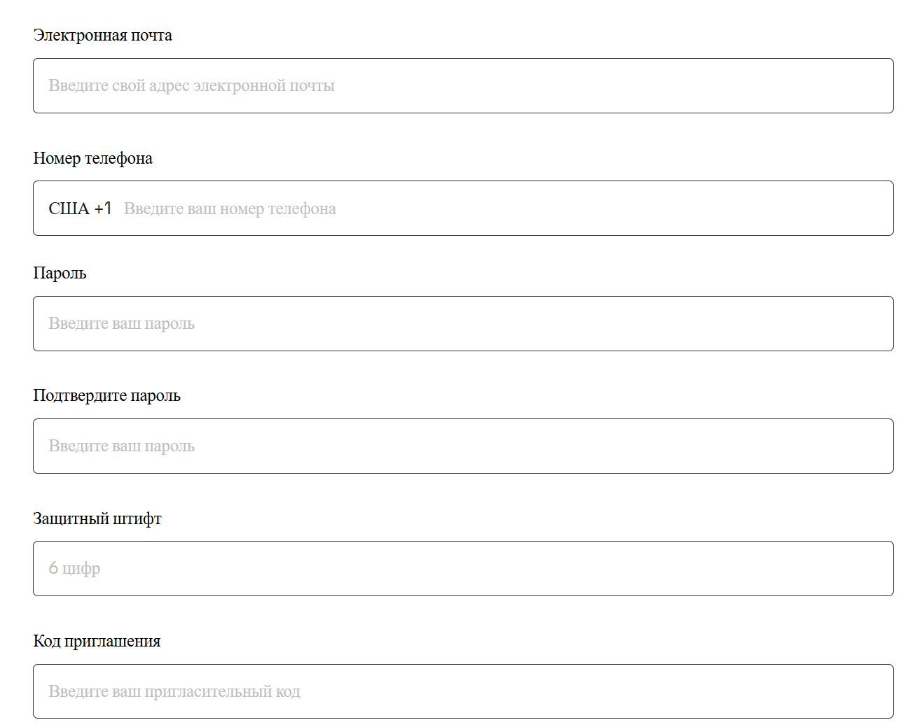 При отсутствии профиля клиентам предлагают нажать на кнопку регистрации. В этом случае от потенциального пользователя требуется email, телефон, пароль, защитный штифт и код приглашения. Где брать информацию в нижних двух графах, не указывается.