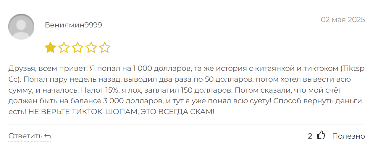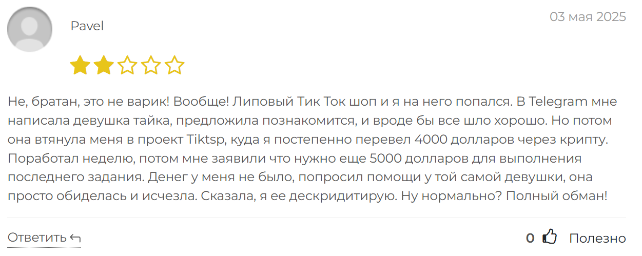 В многочисленных отзывах о Tiktsp CC клиенты рассказывают о реальных последствиях сотрудничества. Pavel говорит, что это поддельный Тик-Ток Шоп, на котором нельзя заработать. Парень рассказал, что постоянно пополнял счет на проекте с помощью криптовалюты и пополнил балан на 4000 USD. Через неделю представители компании заявили, что требуется еще 5000 USD для выполнения задания.