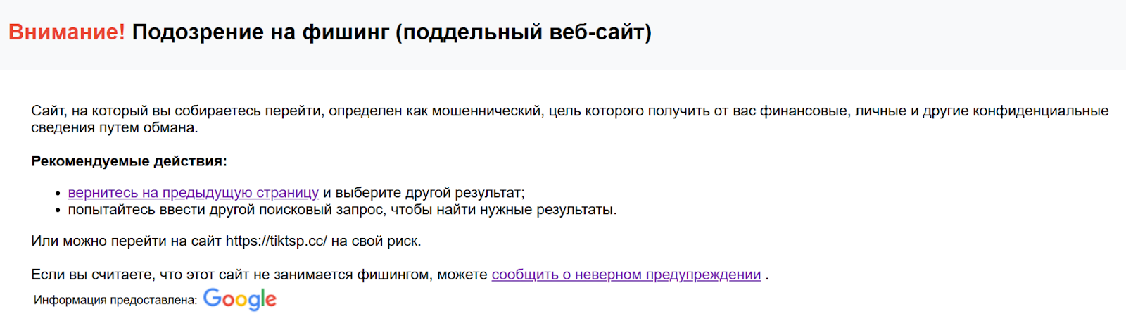 Для предоставления услуг клиентам компании предлагается два сайта — Tiktsp Vip и Tiktsp CC. Они имеют идентичное оформление, но второй уже не доступен. При попытке входа поисковая система выдает предупреждение о рисках кражи данных. Такая особенность говорит о наличии негативной репутации и жалоб со стороны пользователей.