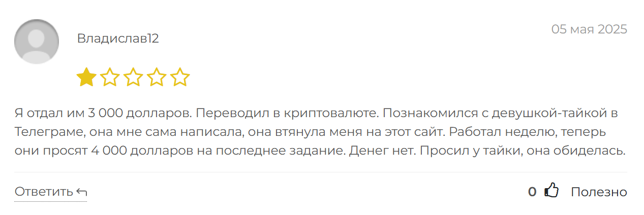Владислав12 рассказал, что отдал платформе 3000 USD. При этом деньги переводились в криптовалюте. По истечении недели от него потребовали передачу дополнительной суммы для выполнения последнего задания.