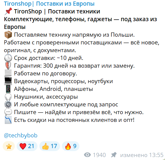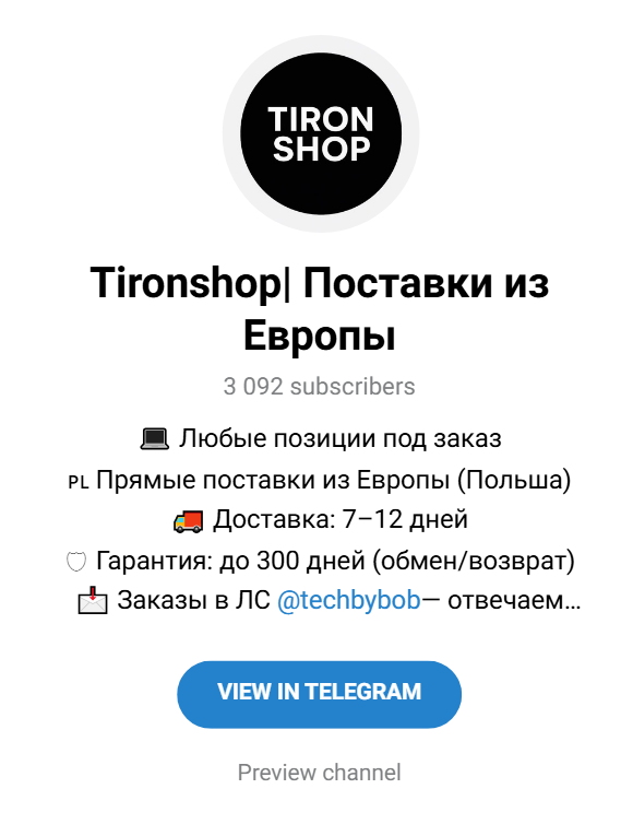 Автор телеграм-канала «Tironshop Поставки из Европы» предлагает покупку разной техники из европейских стран. Уверяет, что все товары оригинальные, идут с документами производителей. С покупателями якобы заключается договор, а также предоставляется официальная гарантия на срок до 300 дней.