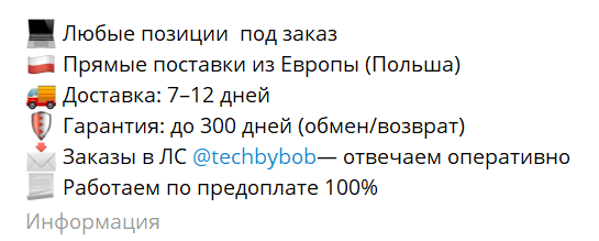 Для заказа нужно писать некому Александру в личные сообщения в ТГ – techbybob. Он обещает доставку по всей России и привлекает покупателей низкими ценами. Чем обоснованы сниженные расценки на оригинальные товары, неизвестно. Работает магазин по полной предоплате, что создает риски для клиентов.