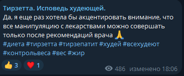 В Телеграме появился канал с интригующим названием «Тирзетта. Исповедь худеющей». Автор – женщина из Петербурга по имени Валерия. Она худеет на препарате тирзепатид и каждый день выкладывает фото весов. Мы решили разобраться, что Тг «Тирзетта» – честный дневник или замаскированная реклама.