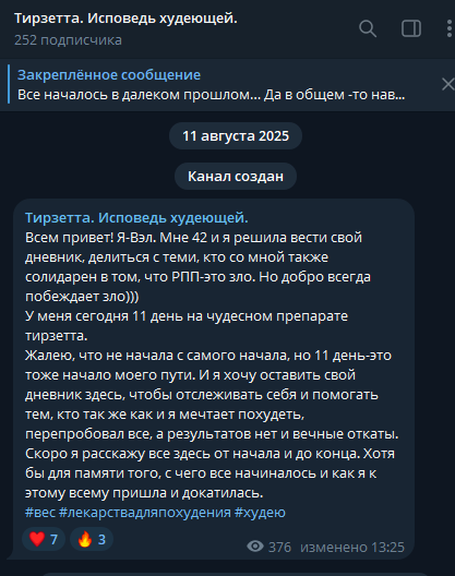 В августе 2025 она пошла к эндокринологу. Врач назначил анализы и выписал тирзепатид. С этого момента начался путь, который автор решила показывать в Телеграм «Тирзетта».