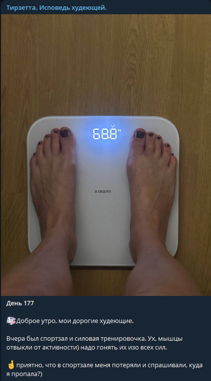 Телеграм «Тирзетта» – это ежедневник. Автор выкладывает фото весов, короткие видео с уколами, комментарии о самочувствии. 26 января вес показал 69 кг. Валерия написала, что накануне поела суши с сыном после его соревнований. Поэтому ждала прибавку. Без драм и эмоций – просто факт.