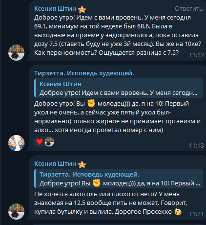 В комментариях подписчики также делятся результатами. Одна девушка за семь месяцев скинула 20 кг и вышла на 70 кг. Другая за четыре дня после первого укола потеряла 1,7 кг. Обсуждают дозы, побочки, реакцию на алкоголь.