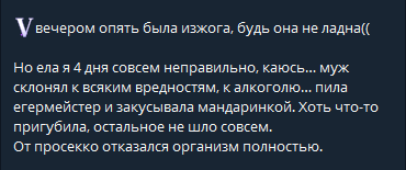 Побочки тоже описывает. Изжога, тошнота, диарея после алкоголя. Организм перестал принимать жирное и спиртное. Был случай – поела шашлык, выпила шампанское. Потом была диарея. Автор шутит, что получила подшивку от алкоголя, хотя не просила.