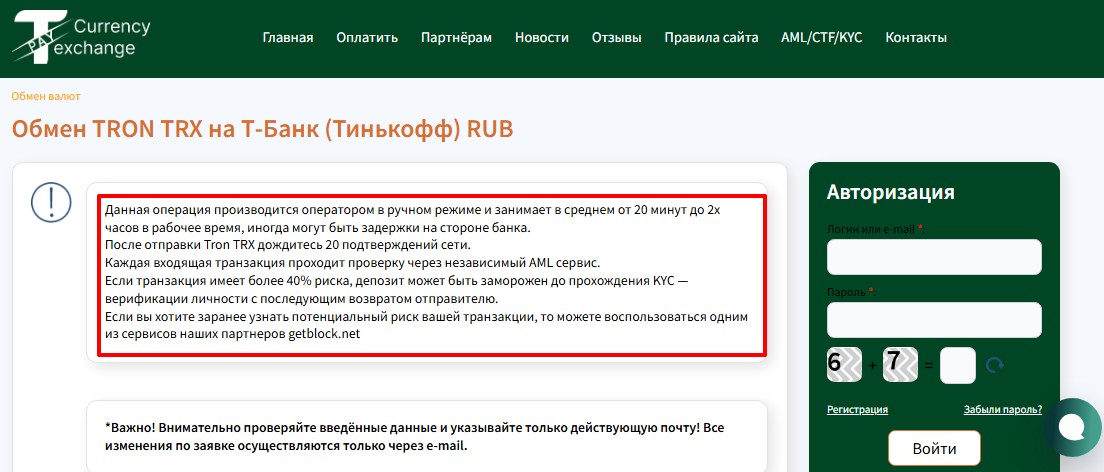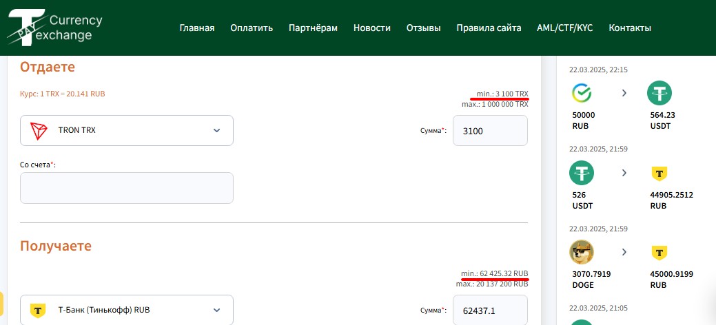 Сколько времени проходит обмен, точно не указанно. Однако по отзывам о Tjspay, все намного медленнее, чем у конкурентов. На это же указывает и необходимость 20 подтверждений сети вместо 5, как на других обменниках. Стоит отметить и ограничения по минимальным суммам.