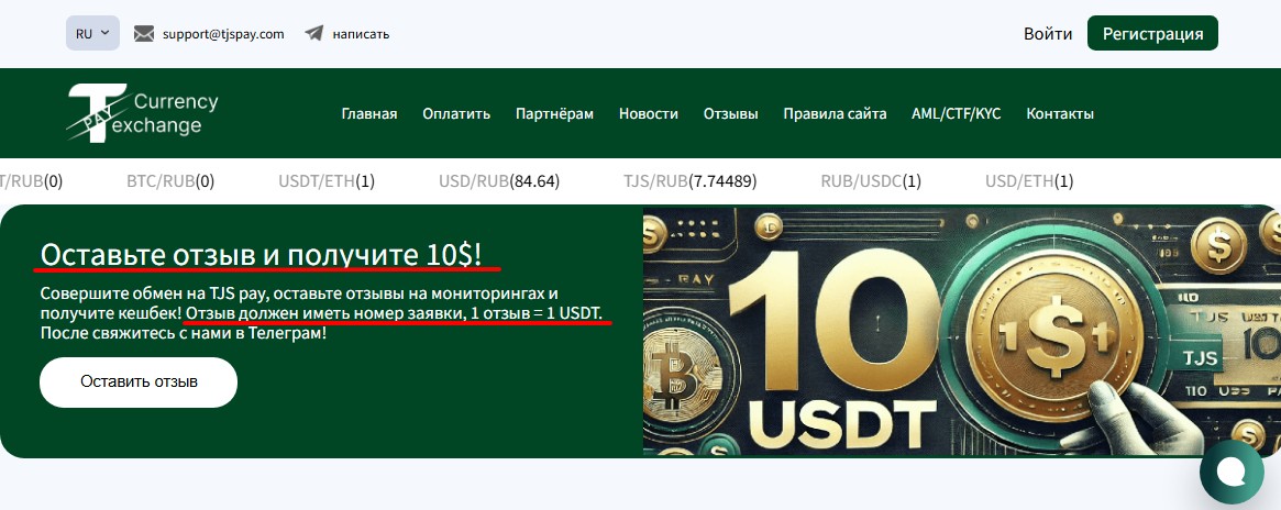 Естественно, на сайте обменника Tjs Pay отзывы оставляют только довольные клиенты. А точнее модераторы предварительно подчищают негатив. Более того они мотивируют публиковать позитивные мнения за деньги. За один комментарий обещают 10 долларов. И тут же уменьшают приз до 1 USDT.