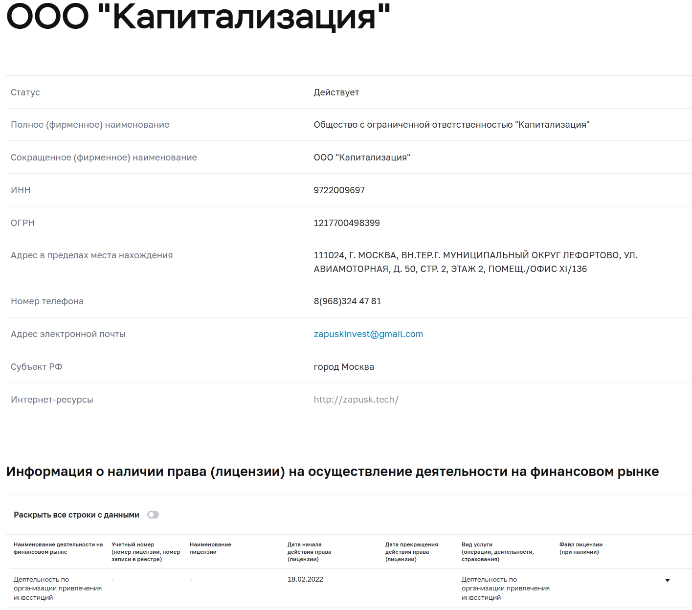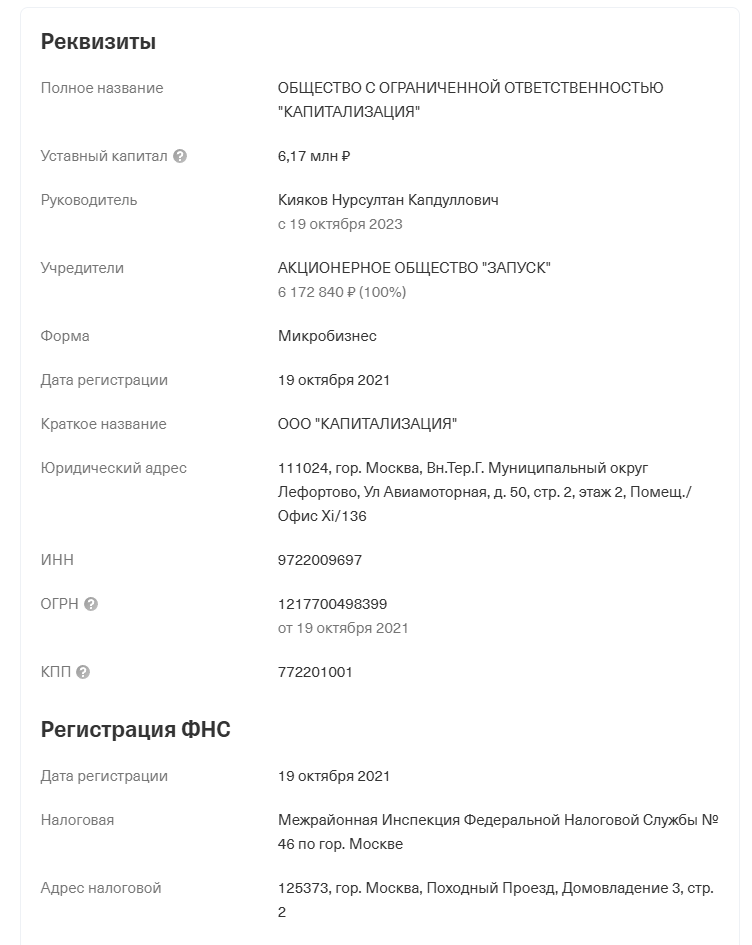 Интересен тот факт, что за Запуском стоит ООО «Капитализация» с учредителем АО «Запуск».