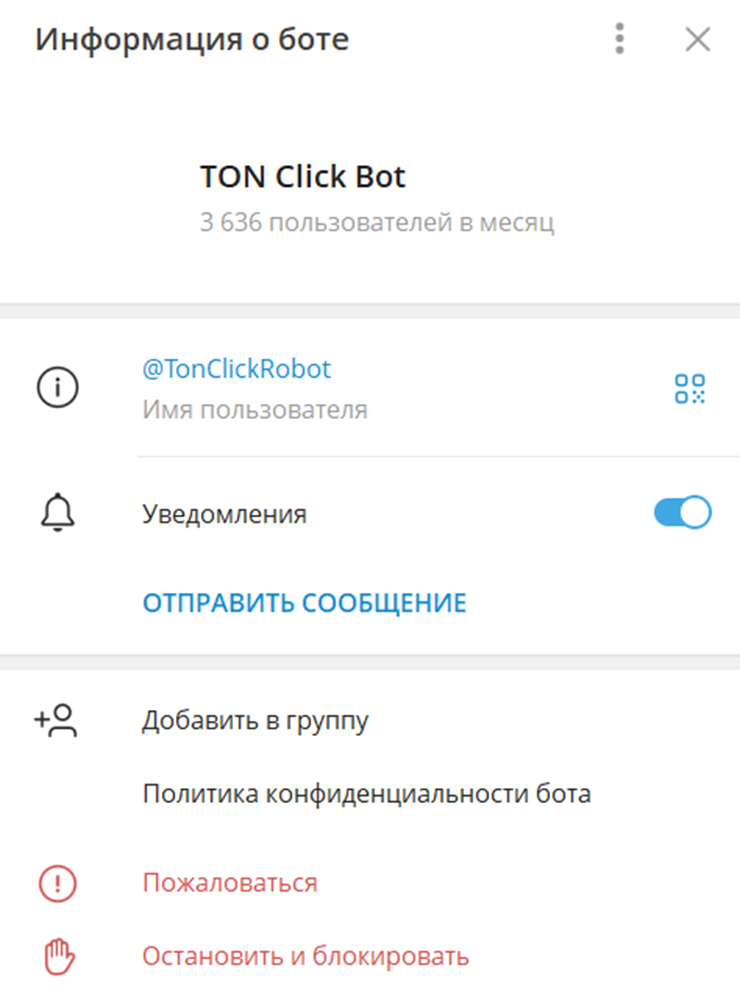Ton Click Bot работает анонимно – мы не нашли никакую информацию о разработчиках и команде. Все данные скрыты. Нет и статистики работы, а также официального разрешения на работу. Это свидетельствует об одном – площадка занимается мошенничеством.