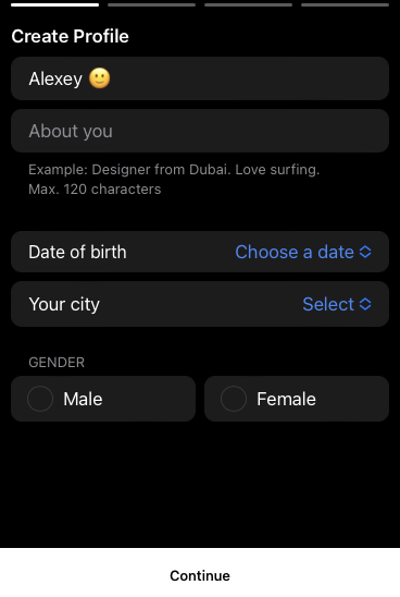 В результате отобразится небольшая анкета, в которой нужно указать имя, описание профиля, дату рождения, город пребывания и пол. После нажатия на Continue потребуется предоставить еще ряд данных: ссылки на аккаунты в соцсетях и пр.