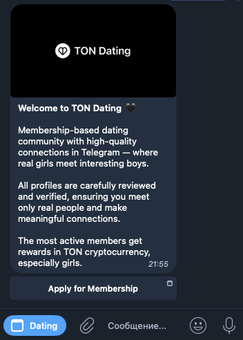 Для регистрации ТГ-сервисе «ТОН Знакомства» нужно перейти в ТГ-бот «ТОН Дейтинг» – ton dating bot. Далее потребуется нажать на кнопку Apply for Membership.