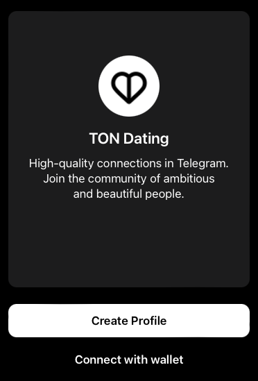 В результате во встроенном в Телеграмм браузере откроется мини-приложение. И следующий пункт в инструкции, как зарегистрироваться в TON Dating – это нажатие на кнопку Create Profile.