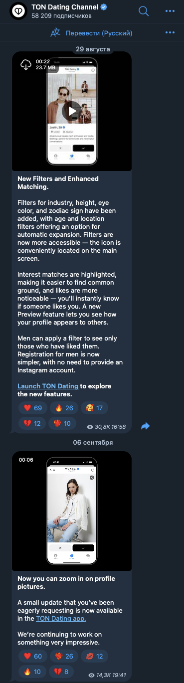 При этом, публикации просматриваются всего 20-30 тысяч раз. В основном, на ТГ-канале TON Dating размещаются новости проекта. Например, разработчики анонсируют свежий функционал, как то: новые фильтры, улучшенные возможности зумирования фото и т.п.