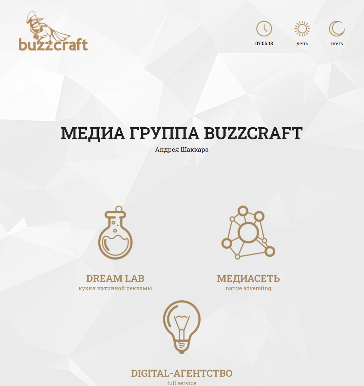 Подробная информация о компании героя материала доступна по ссылке buzzcraft ru. В описании говорится, что медиа-группа Андрея Шаккара занимается тремя направлениями — кухня нативной рекламы, медиасеть и digital-агентство. Каждая из сфер рассматривается индивидуально после перехода.