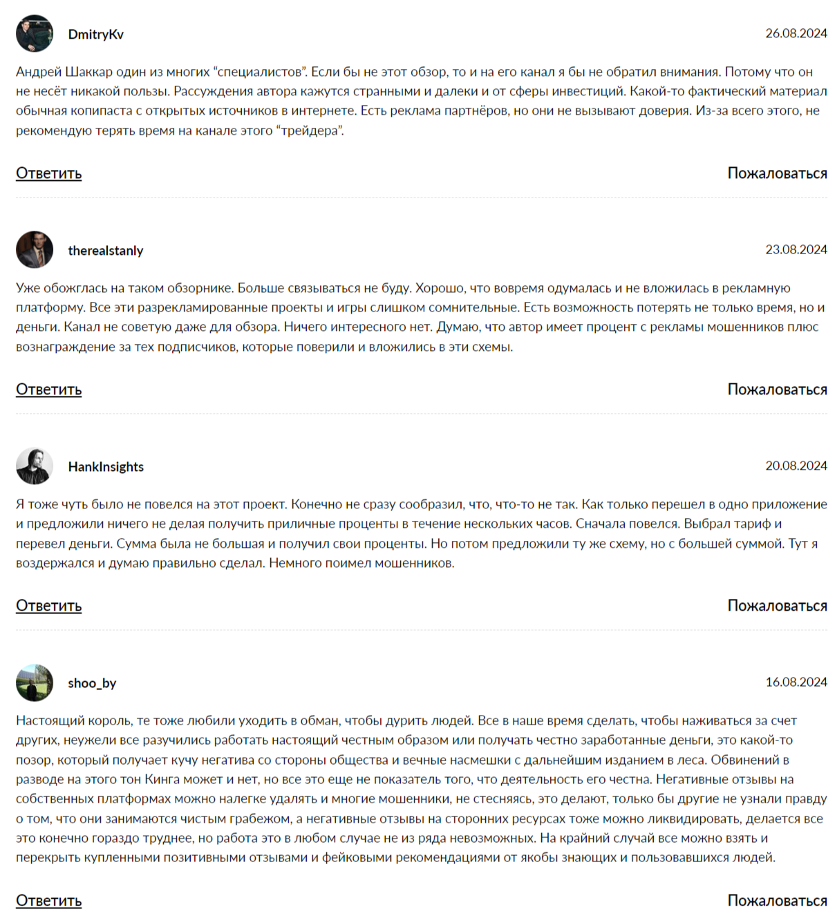 На сторонних сайтах в интернете можно найти ряд негативных отзывов о Тон Кинг. В них подписчики отмечают, что материалы на канале не несут реальной пользы, а такие сведения размещаются в интернете. Те советы, что дает автор, не проверяются и часто приводят к потере денег. На этом фоне многие советуют обходить платформу стороной.