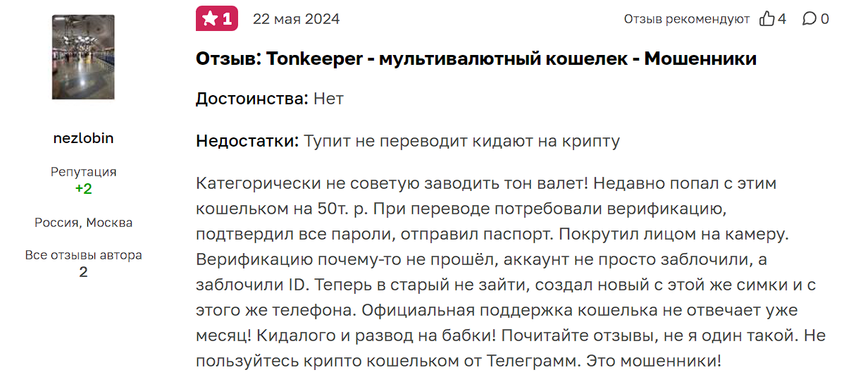 Авторы отзывов обвиняют кошелек «Тонкипер» в мошенничестве и отмечают следующие недостатки кошелька: