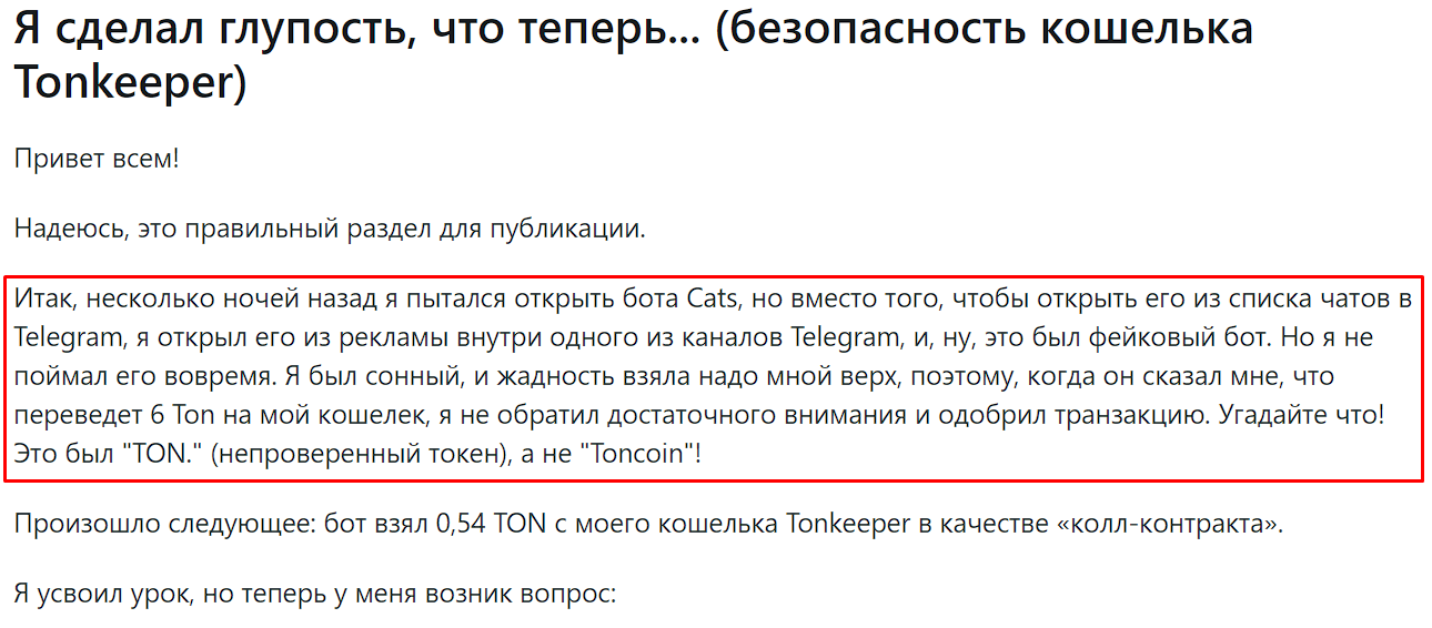 Стоит признать, некоторые отзывы о мошенничестве адресованы не самому Tonkeeper, а его многочисленным фейкам. Как мы отмечали ранее, в Телеграмм работает с десяток скам-платформ с аналогичным названием. Мошенники заманивают людей в фейковый кошелек «Тон Кипер», откуда воруют деньги доверчивых «хомяков».