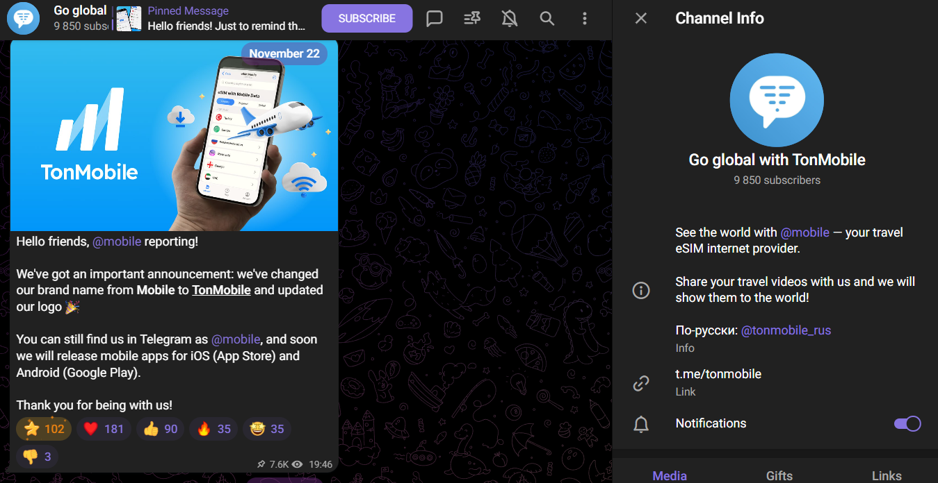 Телеграмм бот TonMobile eSIM собрал аудиторию свыше 170 тысяч человек. Приложение позволяет быстро купить eSIM, выбрав нужную страну и удобный тариф, а также управлять связью, не выходя из мессенджера. Сервис не требует от пользователя верификации, полная анонимность, несомненно, является огромным преимуществом по сравнению с популярными мобильными операторами. Проект имеет официальную поддержку Телеграмм и входит в экосистему TON. В 2021 году оператором стал ООО Тон Эппс, но в 2025 был проведен ребрендинг, теперь компания носит название Tonave Services LTD. Владельцем является Ильяс Тукаев, татарский предприниматель, основным направлением для него является монтаж префаб домов. Однако и крипту он не обходит стороной. В частности, перенес Мобайл есим в ТГ для популяризации монеты Тон.
