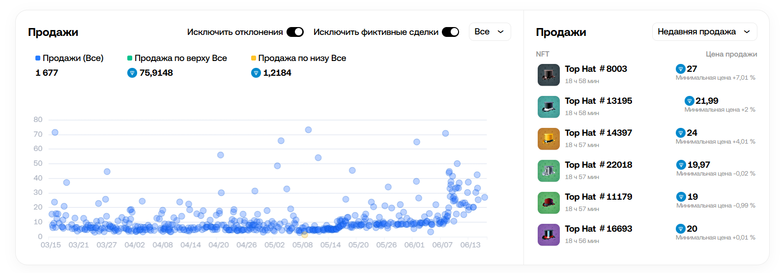 В основном цены держатся вокруг минимума, а это всего 1,22 TON: кто-то решил сделать щедрый дроп. Но есть те, кто покупает с наценкой, особенно за редкие или крутые шляпы (например, #8003 — на 7% дороже минимума). Топовая шляпа цилиндр ушла за 75,91 TON.