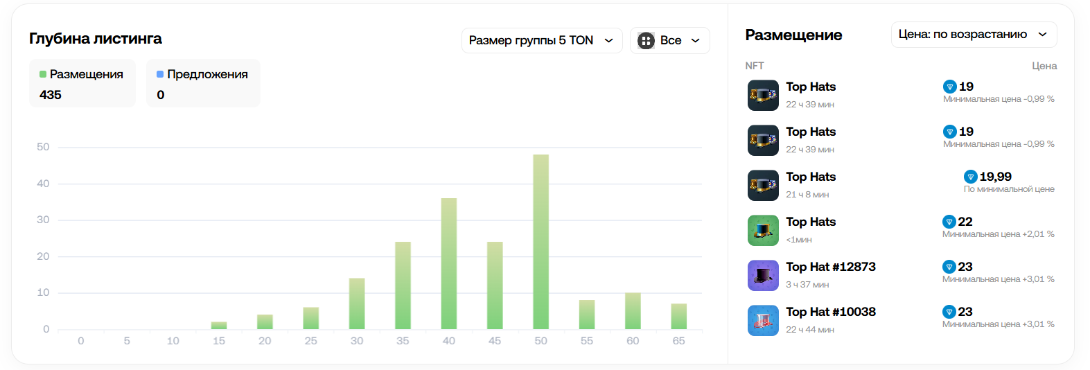 Общее количество лотов в продаже: 435 размещений. Есть из чего выбирать, но пока предложений нет. Возможно покупатели пока просто изучают витрину. Top Hats лидируют по количеству, но цены пляшут от 19 до 23 TON. Минимальная цена иногда снижается до 0,99% (почти даром), а иногда подскакивает на +3.01%.