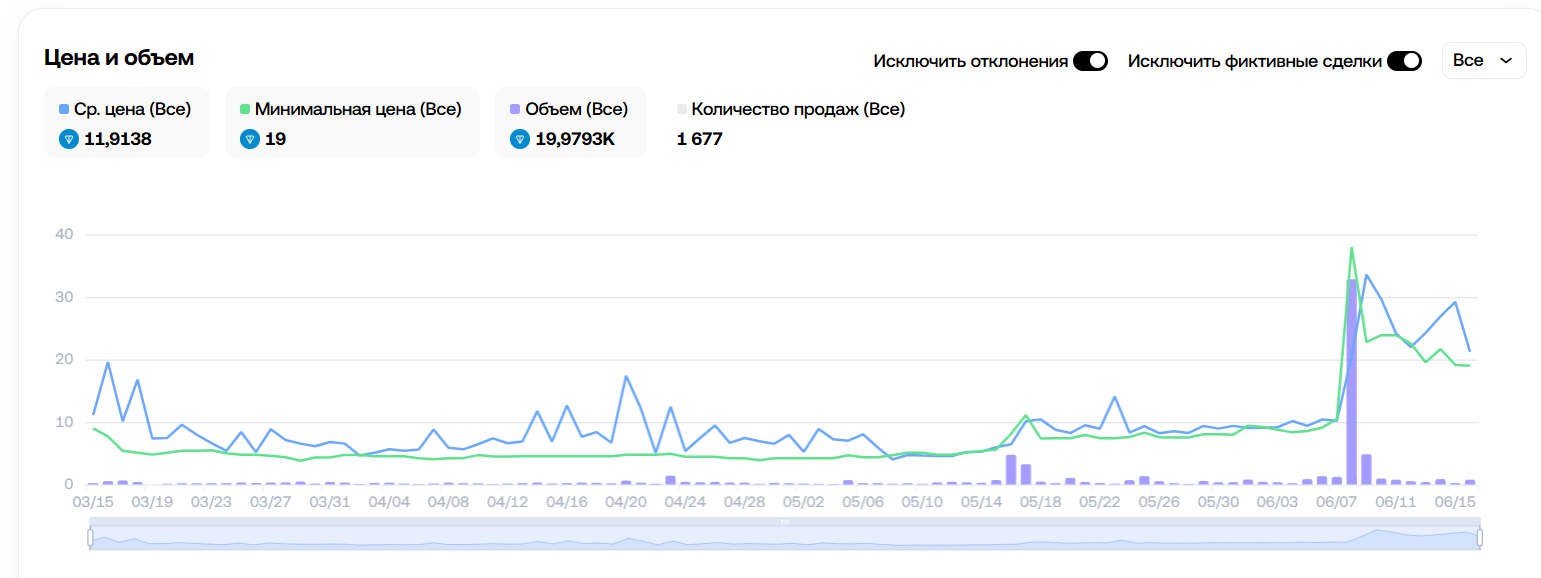 • Непредсказуемость цены: средняя 11,91 TON, но минимум сейчас аж 19 TON.
