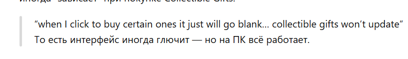• Немного технических шероховатостей: появляются жалобы на баги при покупке через мобильный клиент, но на ПК все работает стабильнее. Это подтверждало мнение из более общей дискуссии по Collectible Gifts.