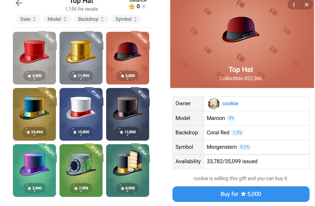 Судя по официальным данным от ТГ, коллекция Top Hat nft, и других “Collectible Gifts”, имеет более 1 400 уникальных вариаций шляп. И это только начальные модели, ожидаются и новые.