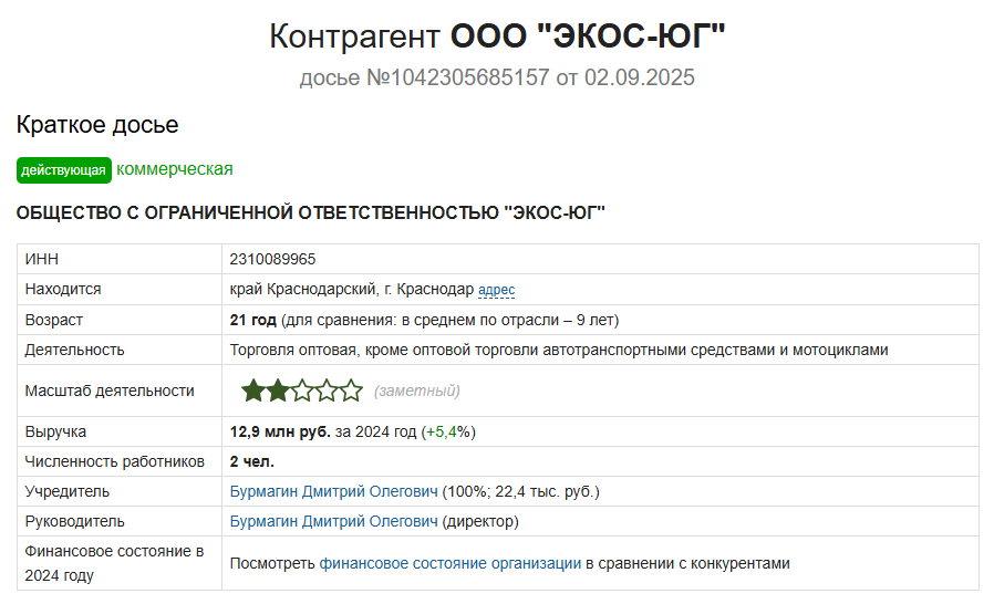 В документах указано, что компания занимается оптовой торговлей и за 2024 год получила выручку более ₽12.9 миллиона. Адрес офиса из выписки и в статье совпадают, есть фотографии.