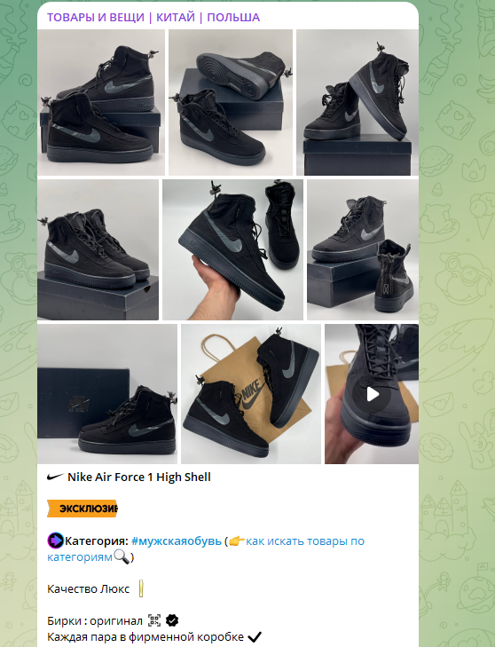 На канале выкладывают копии брендовых товаров. Заявлено, что покупатель получит брендовые бирки.