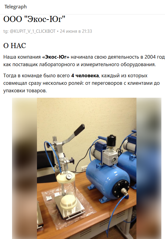 Не обнаружено доказательств, что канал tovar_optom0 связан с ООО «Экос-Юг». Эта организация в реальности занимается продажей лабораторного оборудования, сайт – экос-юг рф.