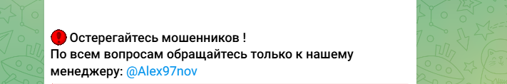 Есть случай с каналом, где в контактах фигурировал все тот же менеджер @ Alex97nov. Там сохранился негативный отзыв: клиент сделал предоплату за оптовый заказ, менеджер принял деньги, обещал быструю доставку и исчез, заблокировав покупателя.