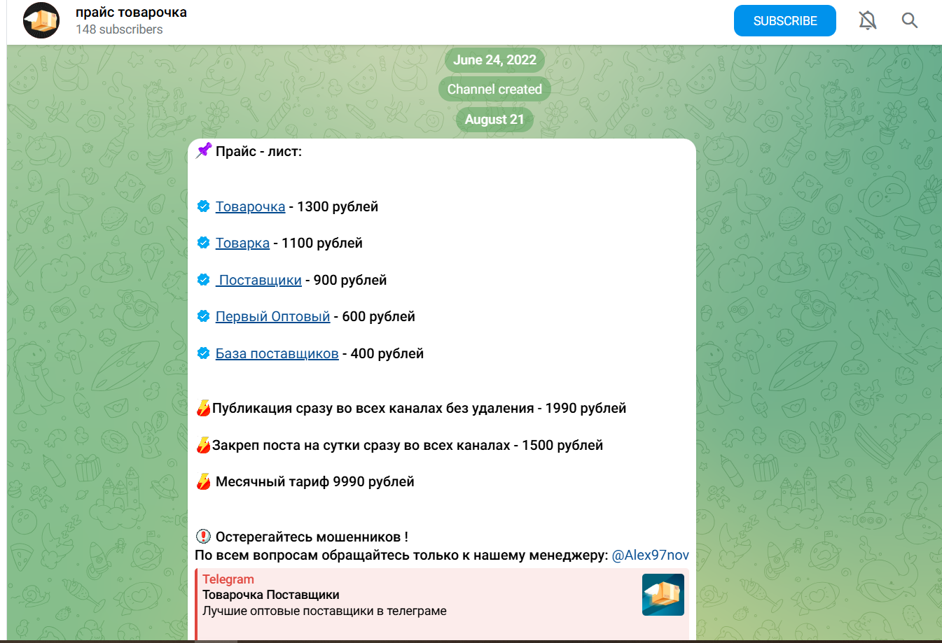 Существует также параллельный канал “Прайс Товарочка”, где прямо прописаны расценки: 400 рублей за доступ к базе поставщиков, около 2 000 рублей за размещение публикации по всем дочерним каналам, закрепы и месячные пакеты под 10 000 рублей.