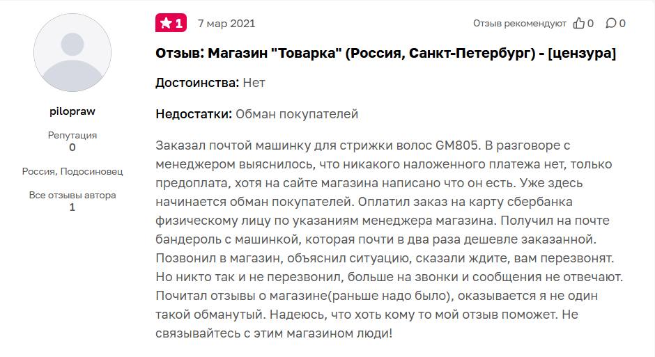 После этого связь с магазином оборвалась, звонки и сообщения игнорировались, и автор отзыва так и остался один на один со своей неудачной покупкой.