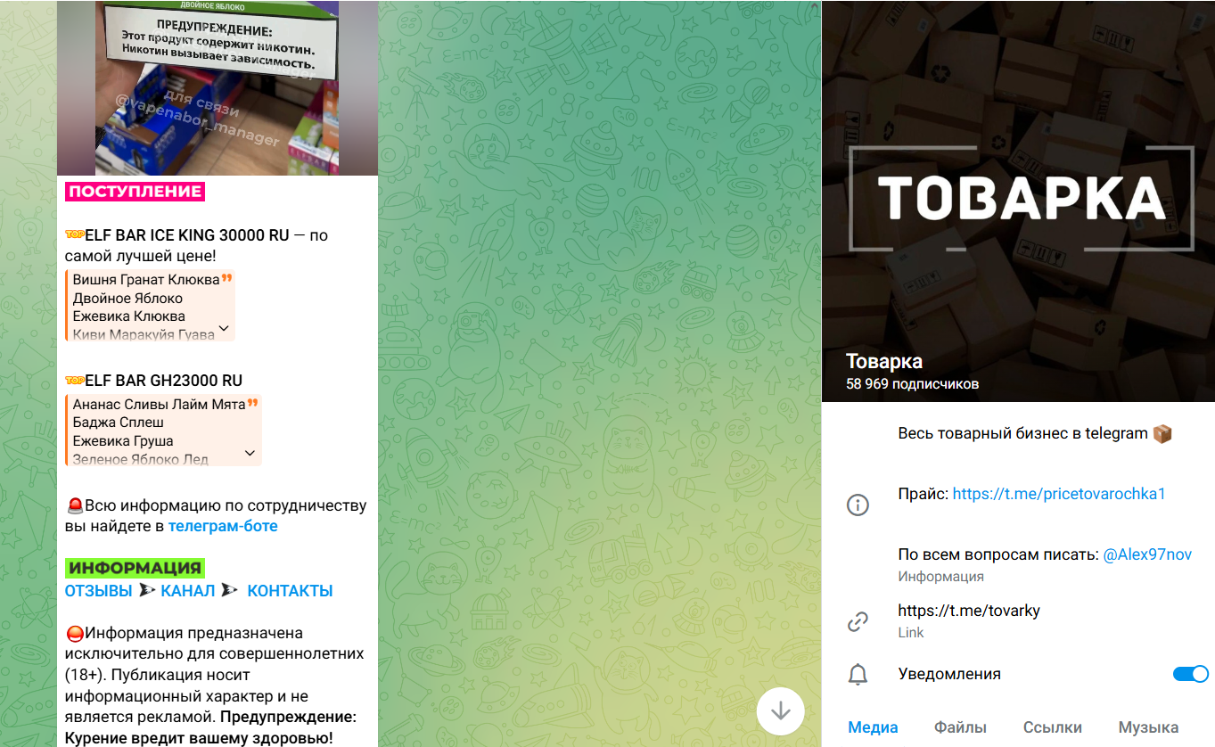 Автор канала “Товарка” телеграм остается анонимным, комментарии к постам закрыты, юридических реквизитов нет. Для связи указан единственный контакт — менеджер @ Alex97nov, которого администрация называет официальным и параллельно предупреждает о мошенниках, маскирующихся под “Товарку” и делают поддельные прайсы pricetovarochka1.