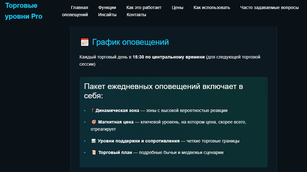 В качестве примера, размещен образец торгового плана от 24 февраля 2025 года, он включает в себя: динамические зоны, магнитную цену, уровни поддержки и сопротивления, а также торговый план с бычьими медвежьими сценариями. Это выглядит как адаптированный шаблон Smart Money, он не сильно подходит для реальной торговли.Пользователям предлагают вручную переносить предложенные уровни в TradingView — это, по сути, текстовая подписка без автоматической интеграции и без подтвержденных инструментов анализа, что делает ее больше обучающим продуктом, чем реальным торговым сервисом. Тем более, что проект Трейд Левелс Про, фактически не предоставляет собственного торгового терминала, бота или платформы для сигналов. Все уведомления поступают через Substack в виде ежедневной рассылки.