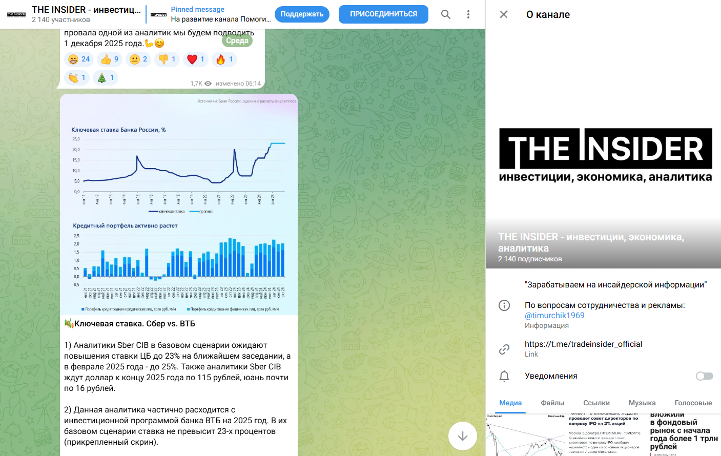 Канал работает по ссылке @tradeinsider_official. Создан 5 ноября 2024 года. Собрал чуть более двух тысяч подписчиков. Посты имеют примерно по 1,1-1,6 тысяч просмотров, поэтому если тут и были накрутки, то минимальны.