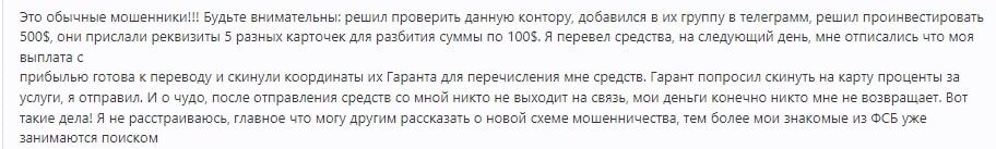 Для входа в проект потребуется внести оплату в размере 2 500 рублей. При этом никаких гарантий пользователям проект не предоставляет — отсутствует даже верифицированная статистика успешных сделок. Не говоря уже о том, что заявления об опыте в трейдинге, скорее всего, тоже ложь — не удалось найти ни единого достоверного факта, указывающего на это.На канале можно найти отзывы о Trading Navigator” от якобы “довольных клиентов”, однако все они выглядят сомнительно и не вызывают доверия. Такие рецензии всегда носят исключительно комплиментарный характер, однако не приводят конкретных фактов и причин для сотрудничества с проектом.