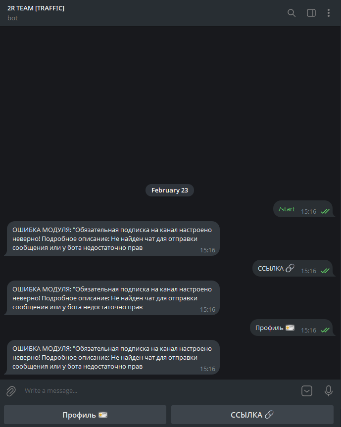 На момент нашей проверки в конце февраля 2026 года проект R2traff Bot не работает так, как задумали его создатели. На экране появляется сообщение об ошибке, предназначенное для разработчиков и связанное с требованием обязательной рекламной подписки для работы сервиса.