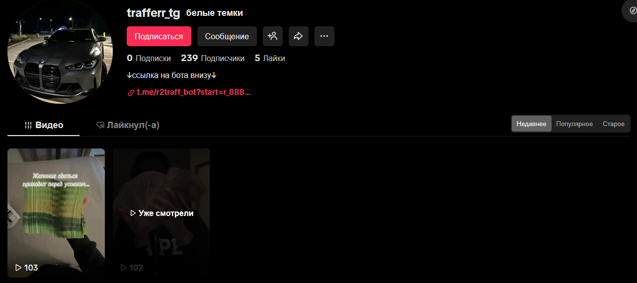 Канал «Белые темки» в ТикТок, который связан с рассматриваемым проектом, насчитывает 239 подписчиков, но в нем всего два опубликованных видео. Предметной информации в них нет, только реклама богатой жизни и ссылка на паблик в Телеграм.