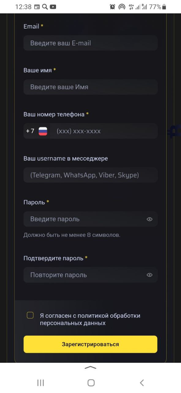 Регистрация личного кабинета на сайте traffixxx io выглядит просто. На начальном этапе не требуется никакой верификации. Всего шесть полей: имя, фамилия, адрес электронной почты, номер телефона, ник в мессенджерах соцсетей и пароль. Затем идет флажок о согласии с обработкой ваших данных.