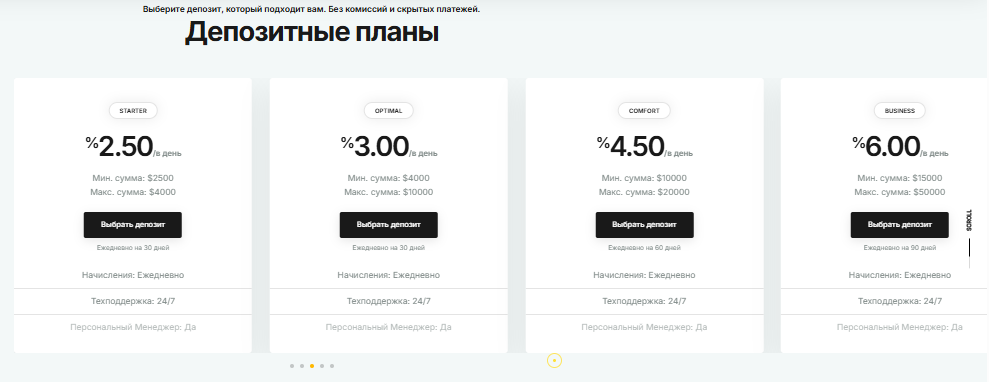 На сайте указано, что существует 8 типов счетов. На всех клиентам предоставляется персональный менеджер. Проценты начисляются ежедневно.