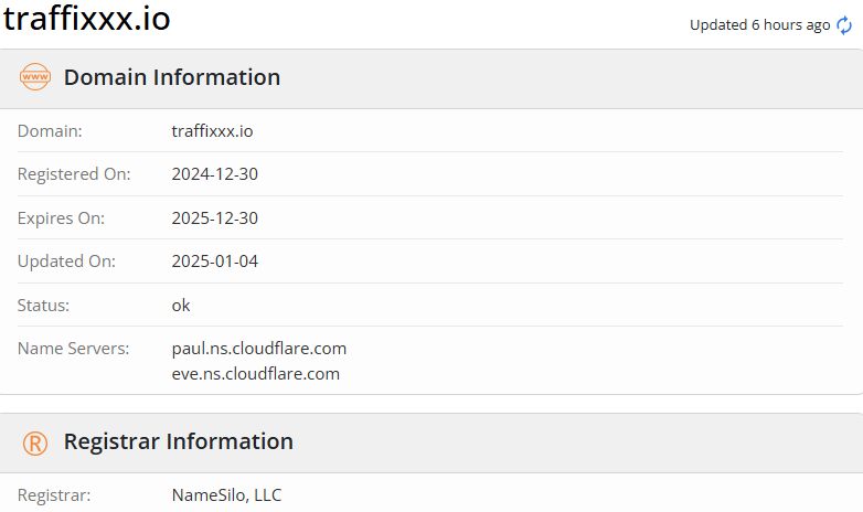 Отметим, что ранее подобный проект имел домен traffixxx com. Кроме того, Traffixxx зарегистрировала свой домен через NameSilo, что является негативным знаком. Этот регистратор популярен среди владельцев анонимных веб-сайтов. Поскольку он позволяет скрыть владение доменом и обеспечивает быстрые изменения в регистрационных записях. Солидные компании предпочитают более престижных регистраторов, таких как Google Domains, GoDaddy или Cloudflare.